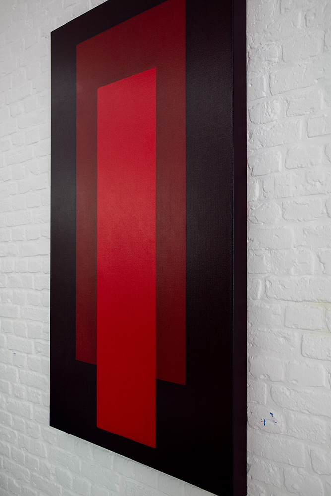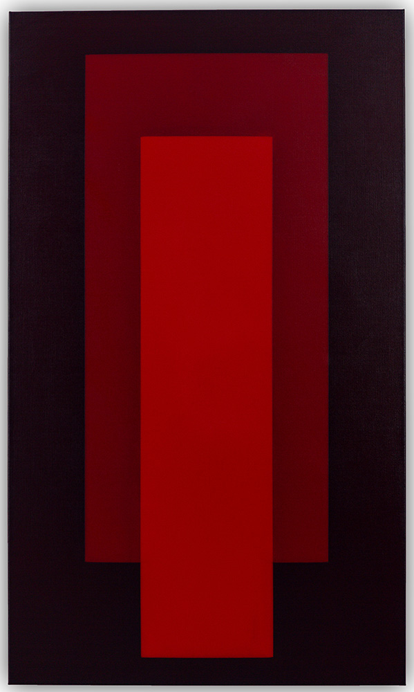 Ein leuchtend roter, vertikaler Balken in der Mitte tritt in Spannung zu einer dunkleren Randzone, während der Übergangsbereich zwischen beiden Farbfeldern eine vibrierende optische Zone erzeugt.