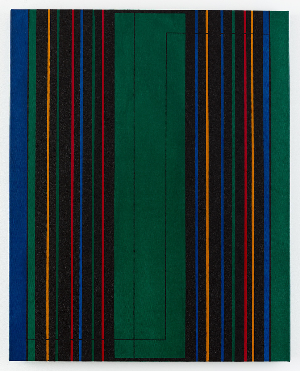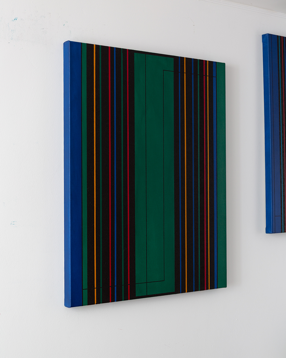Dieses Werk verbindet präzise geometrische Strukturen mit einer kraftvollen Farbgebung. Vertikale Linien in Blau, Rot, Gelb und Schwarz bilden eine rhythmische Komposition, die durch tiefgrüne Flächen kontrastiert wird. Das Ergebnis ist ein dynamischer und dennoch ausgewogener Dialog zwischen Ordnung und Bewegung.