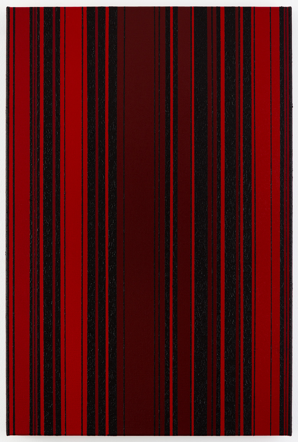 Dieses abstrakte Gemälde untersucht den Rhythmus und die Spannung zwischen Rot und Schwarz durch präzise ausbalancierte vertikale Strukturen.