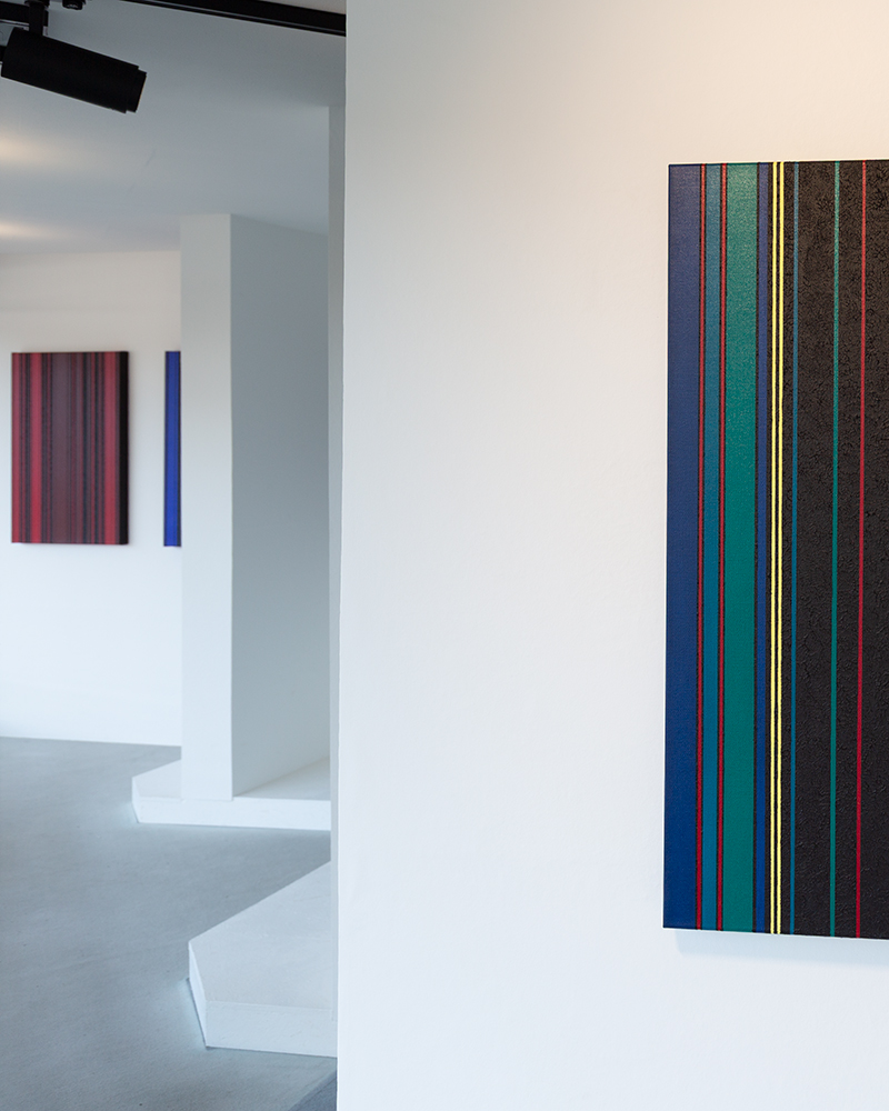 Seine Arbeiten untersuchen rhythmische Strukturen, präzise Farbbeziehungen und das Spannungsverhältnis zwischen Transparenz und Materialität.