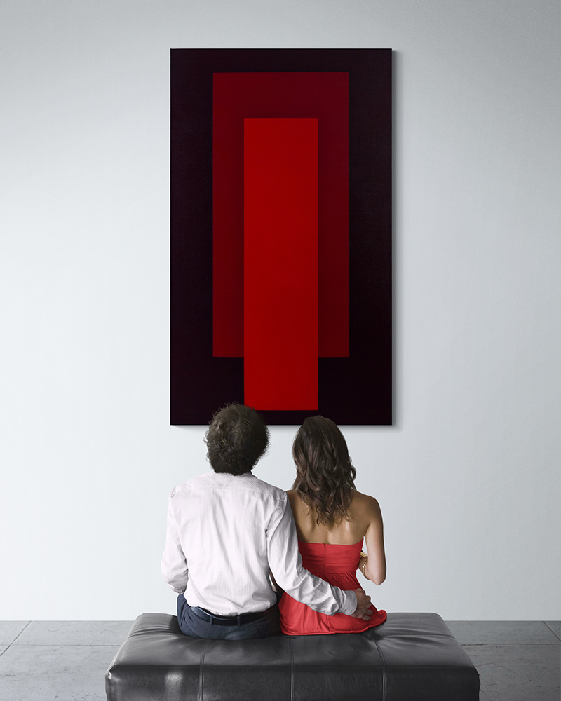 Durch diese präzise Abstimmung entsteht eine ruhige, kontemplative Wirkung – trotz der kraftvollen chromatischen Präsenz des Rots.