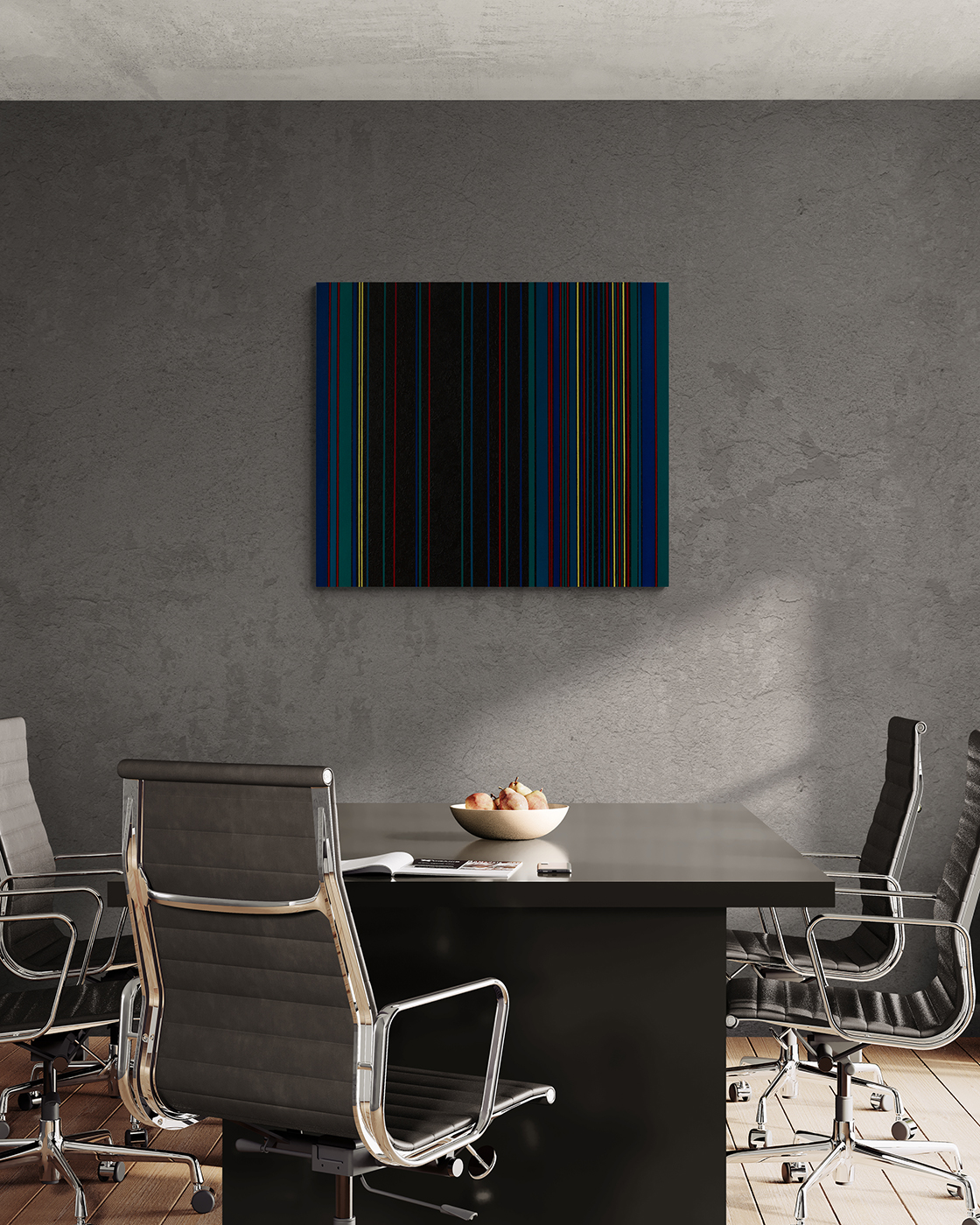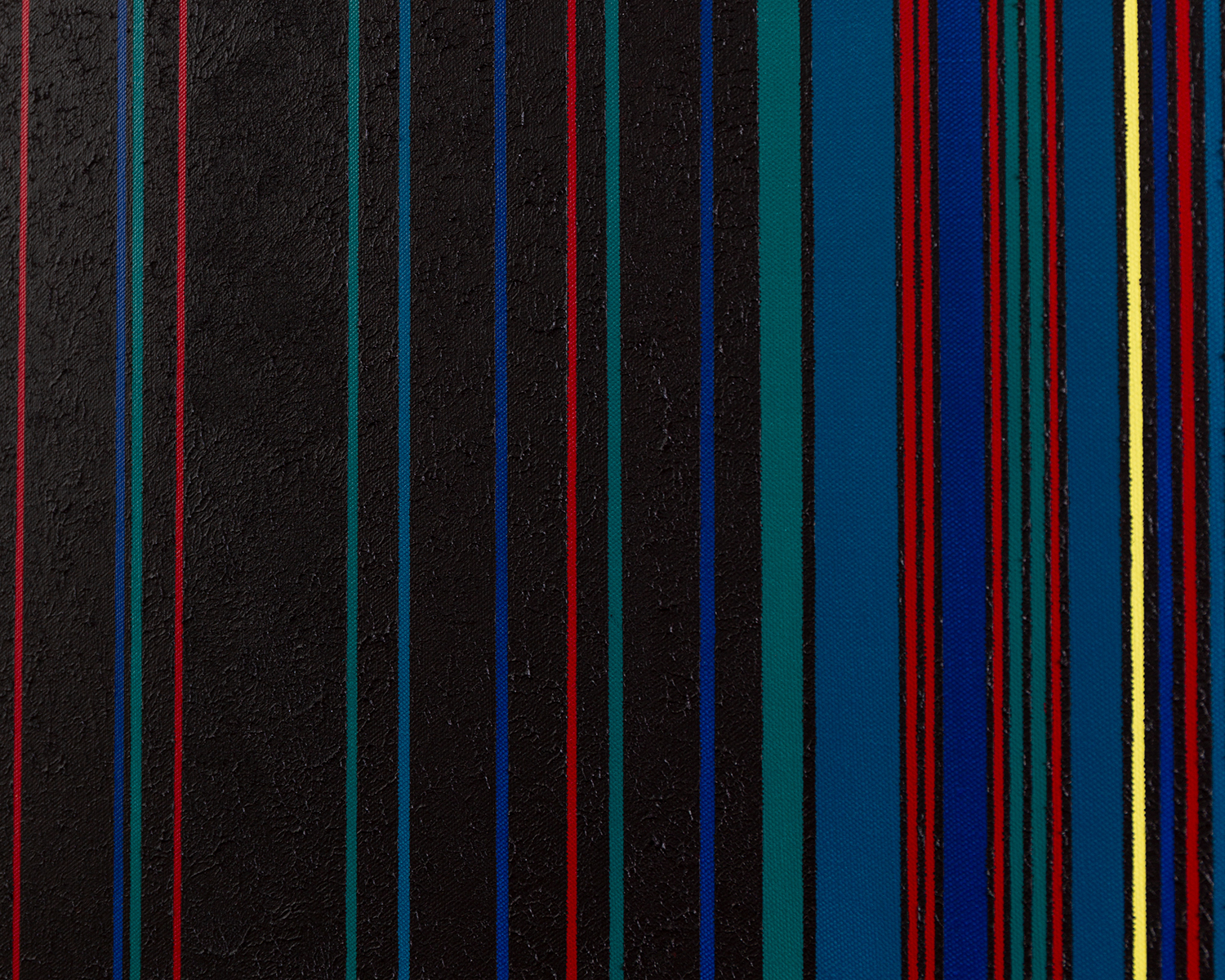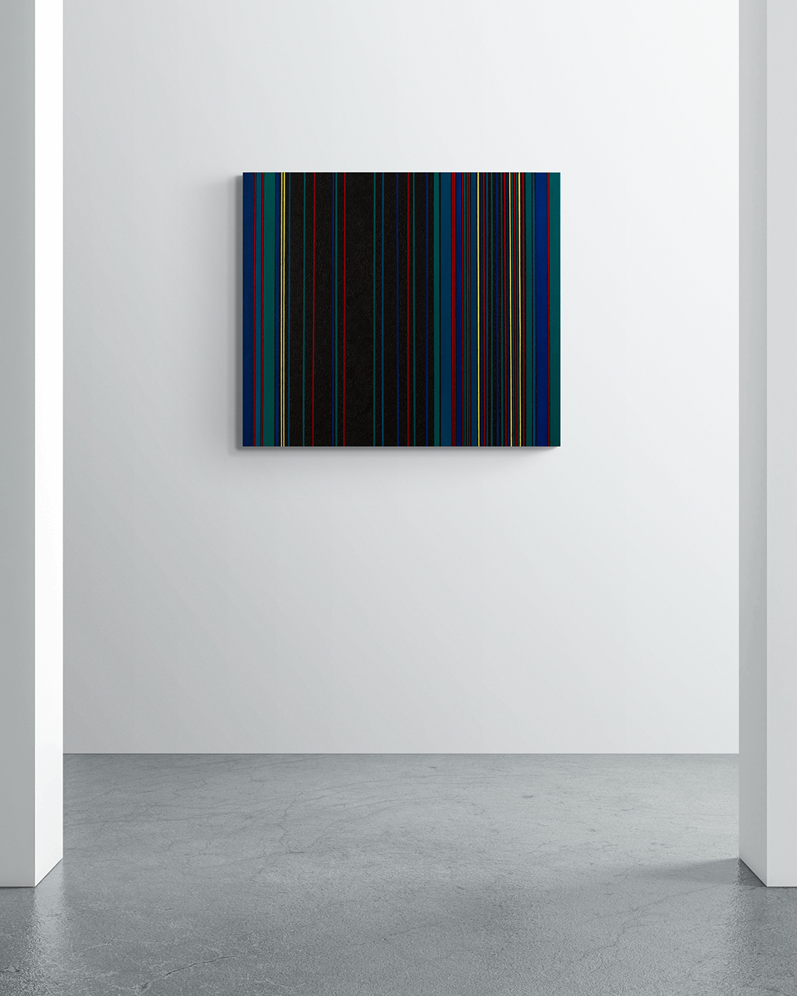 Gemälde: Geometrisch, abstrakt mit senkrechten blauen, grünen, roten, schwarzen und gelben Streifen. Minimalistische Streifen Farbfeldmalerei.