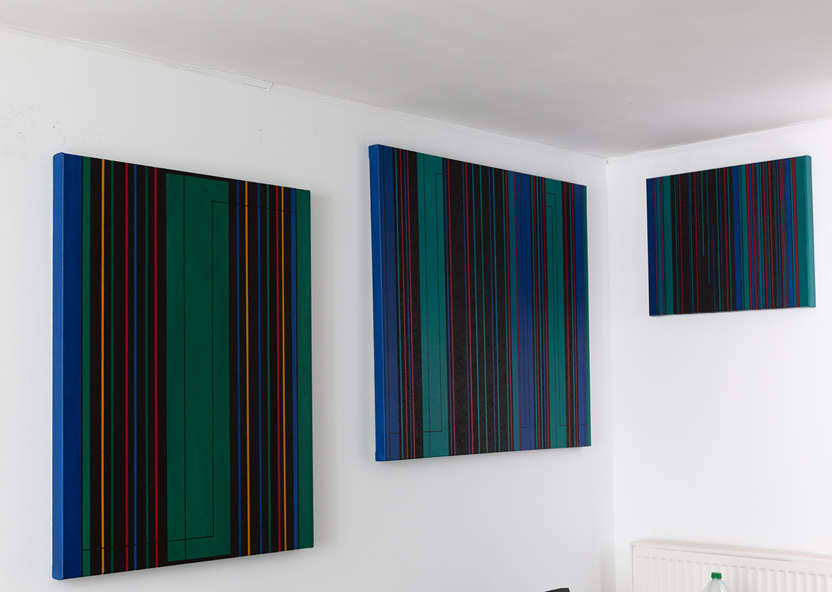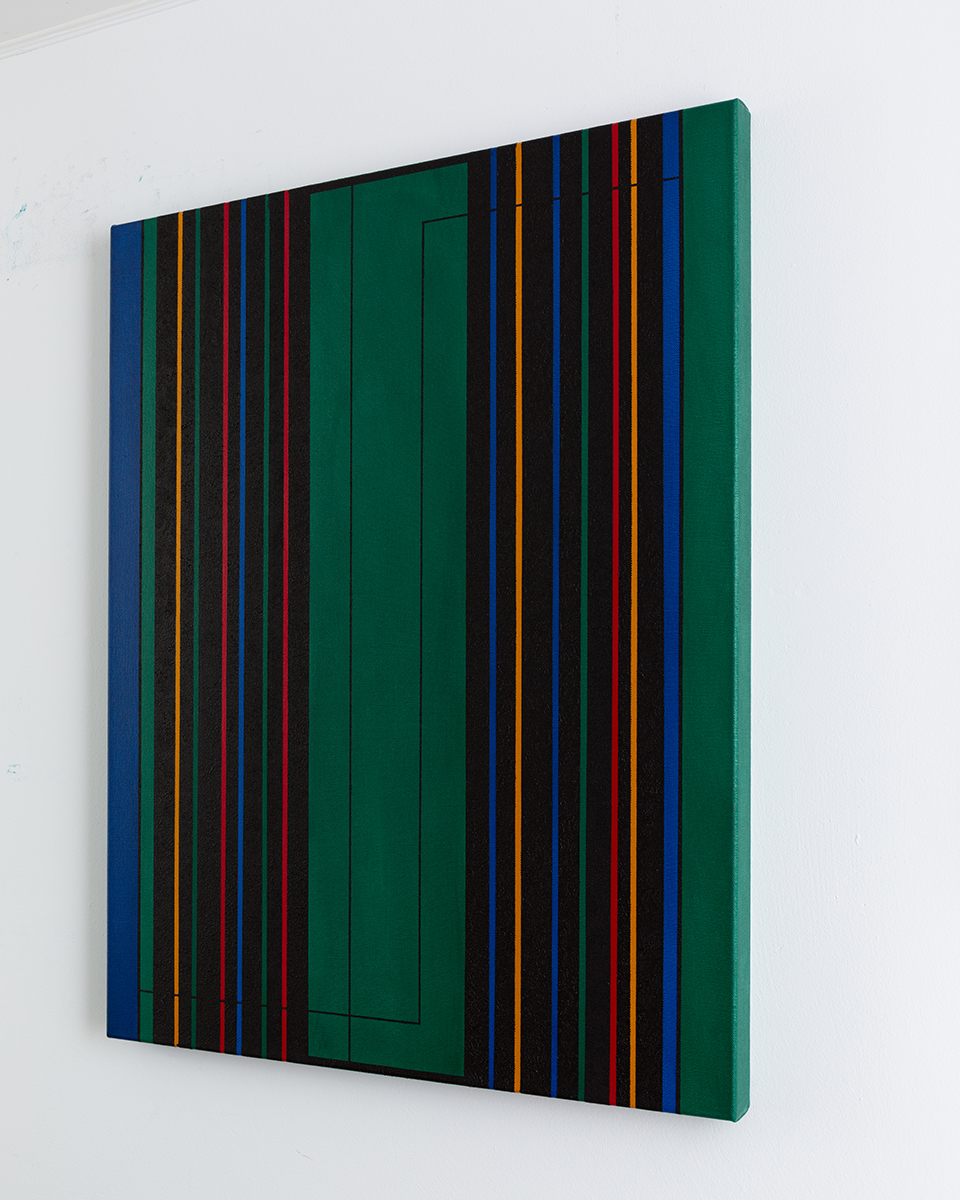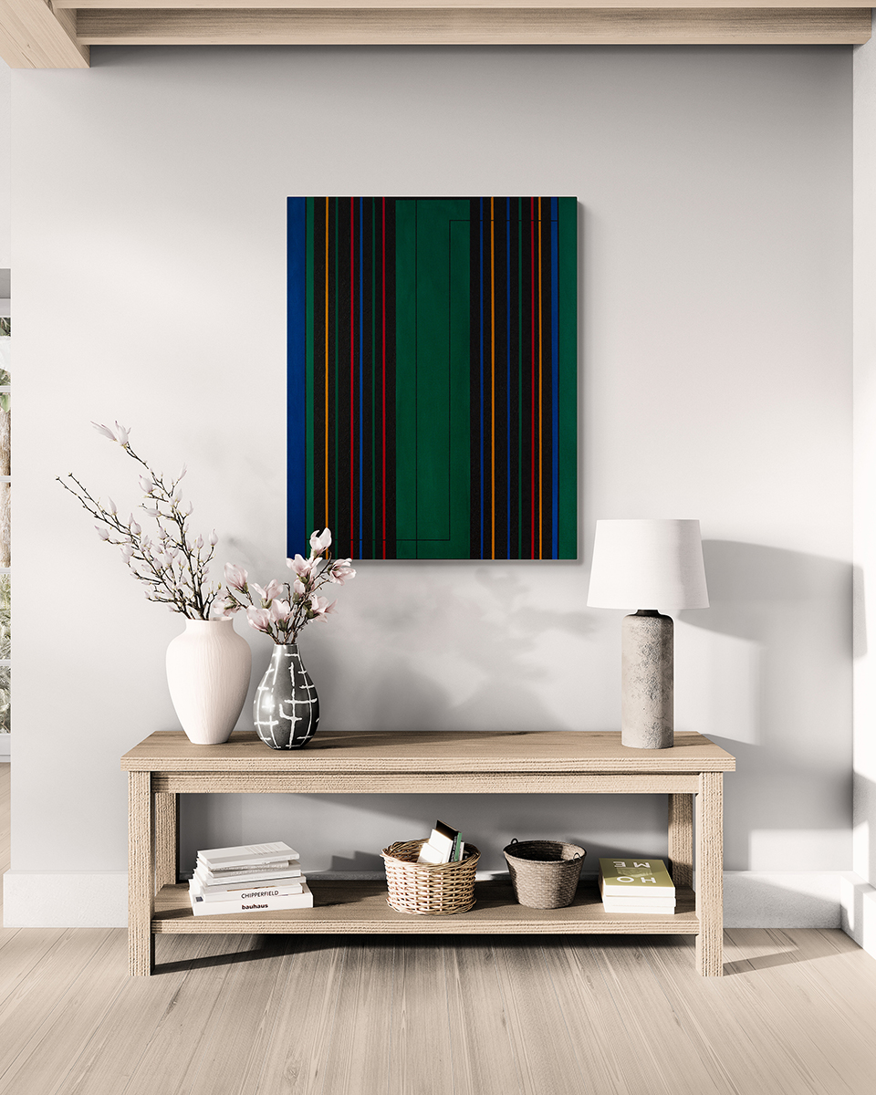 Dieses Werk verbindet präzise geometrische Strukturen mit einer kraftvollen Farbgebung. Vertikale Linien in Blau, Rot, Gelb und Schwarz bilden eine rhythmische Komposition, die durch tiefgrüne Flächen kontrastiert wird. Das Ergebnis ist ein dynamischer und dennoch ausgewogener Dialog zwischen Ordnung und Bewegung.