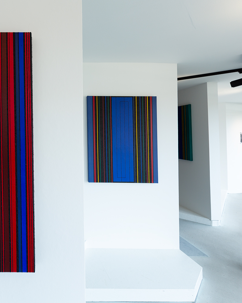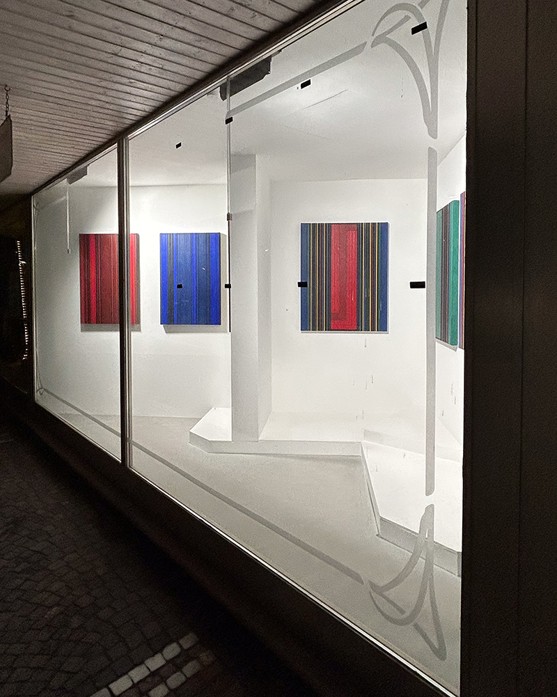 Seine Arbeiten untersuchen rhythmische Strukturen, präzise Farbbeziehungen und das Spannungsverhältnis zwischen Transparenz und Materialität.